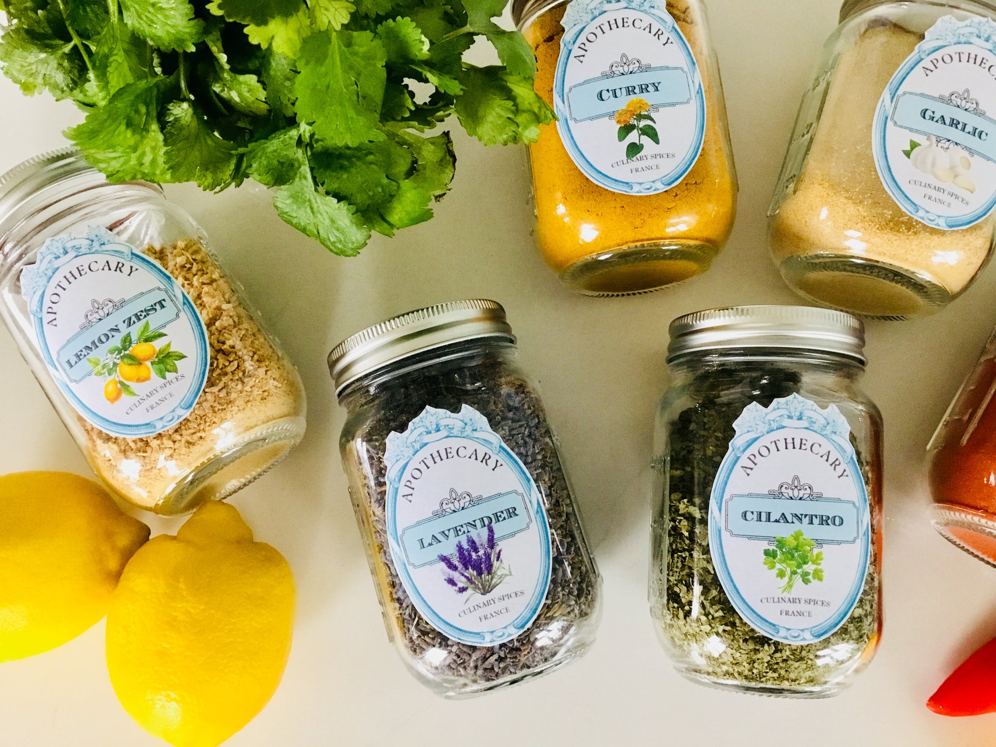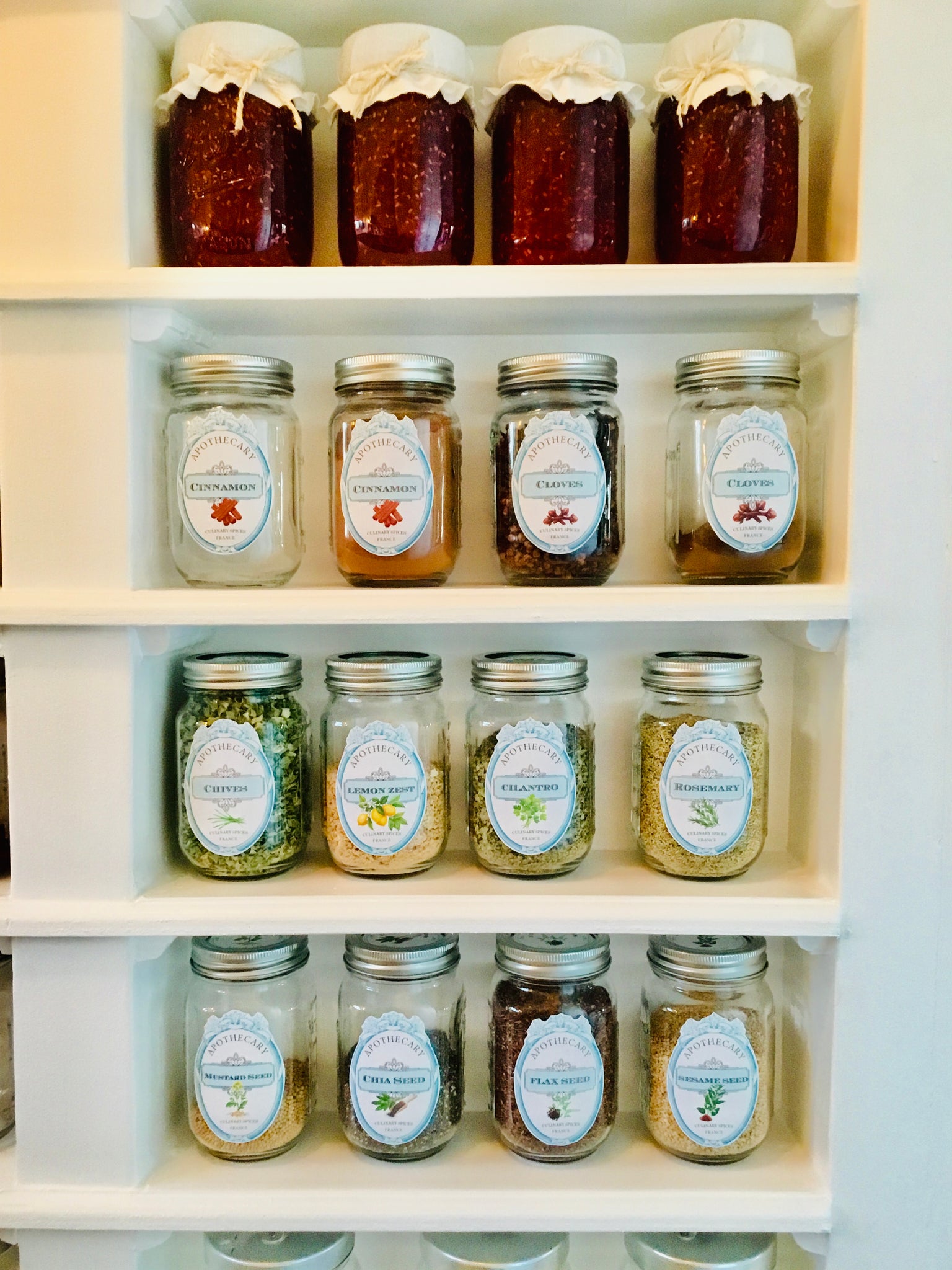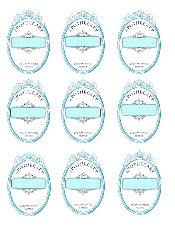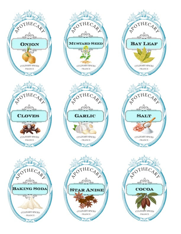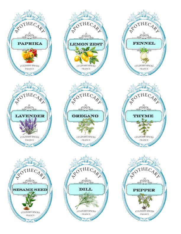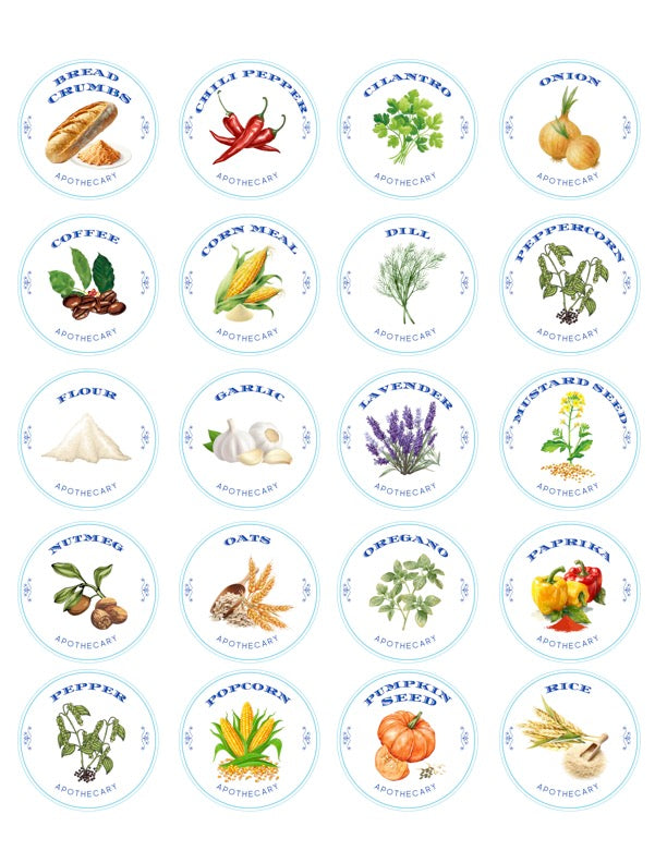 Each label features the name of the herb or dried good with a charming artistic rendering as well. I have even included small round spice jar top labels for canning jar size lids.