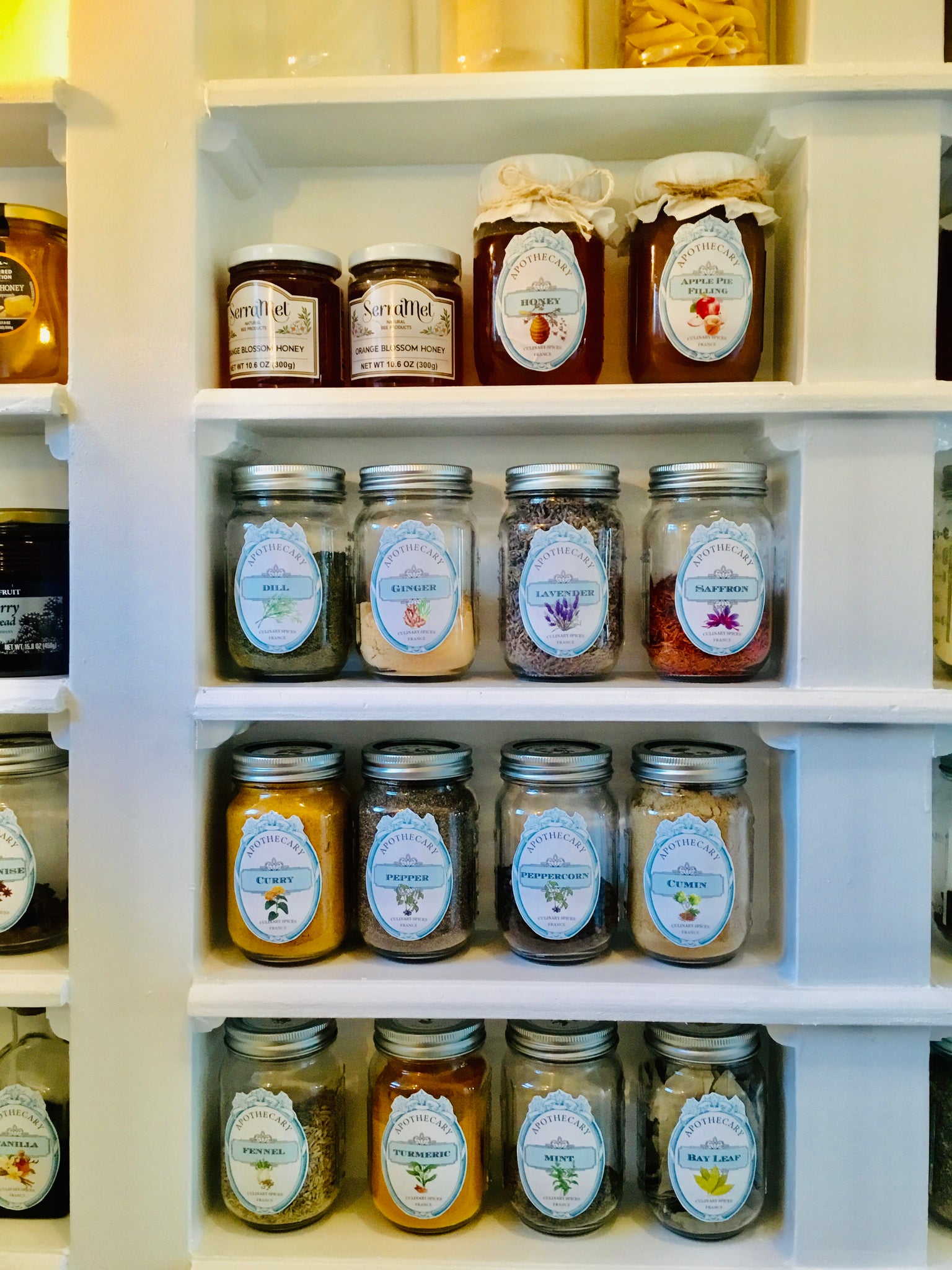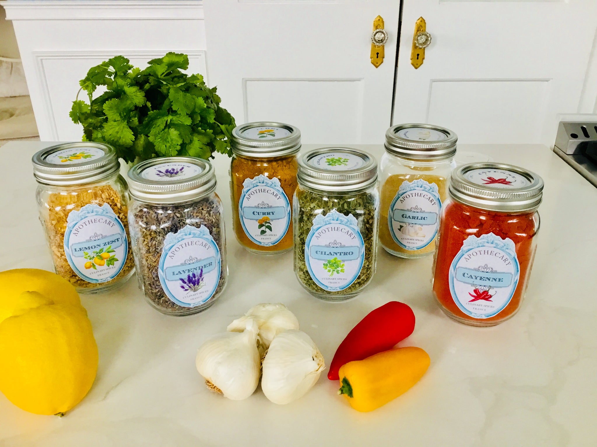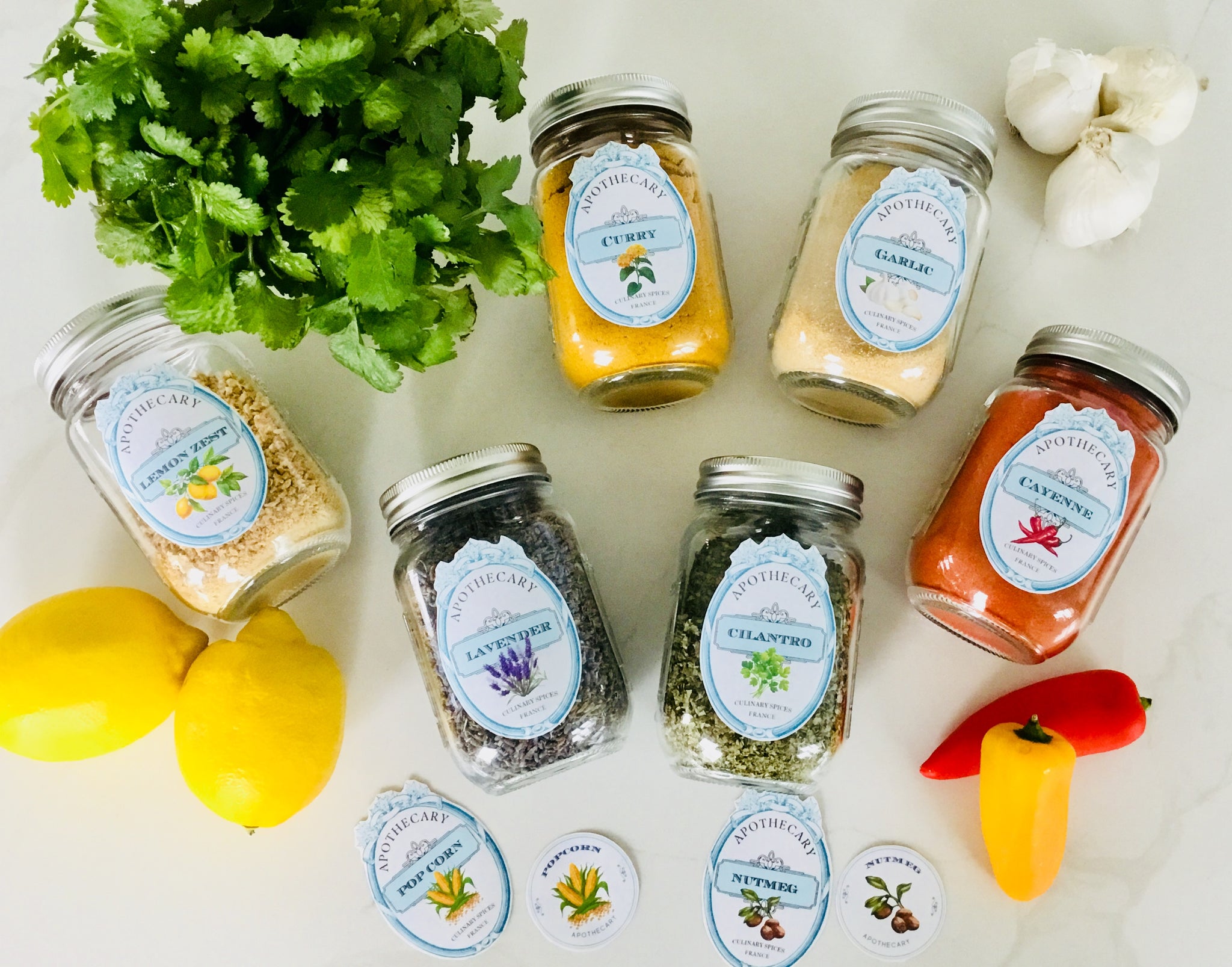 Each label features the name of the herb or dried good with a charming artistic rendering as well. I have even included small round spice jar top labels for canning jar size lids.