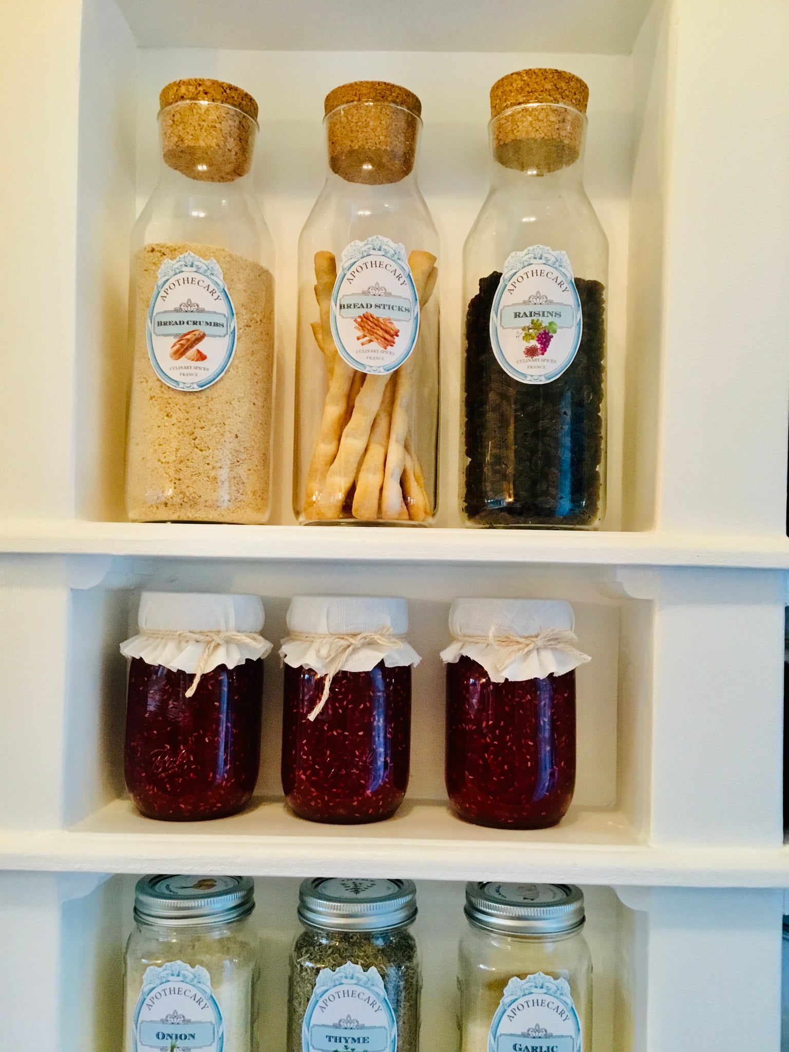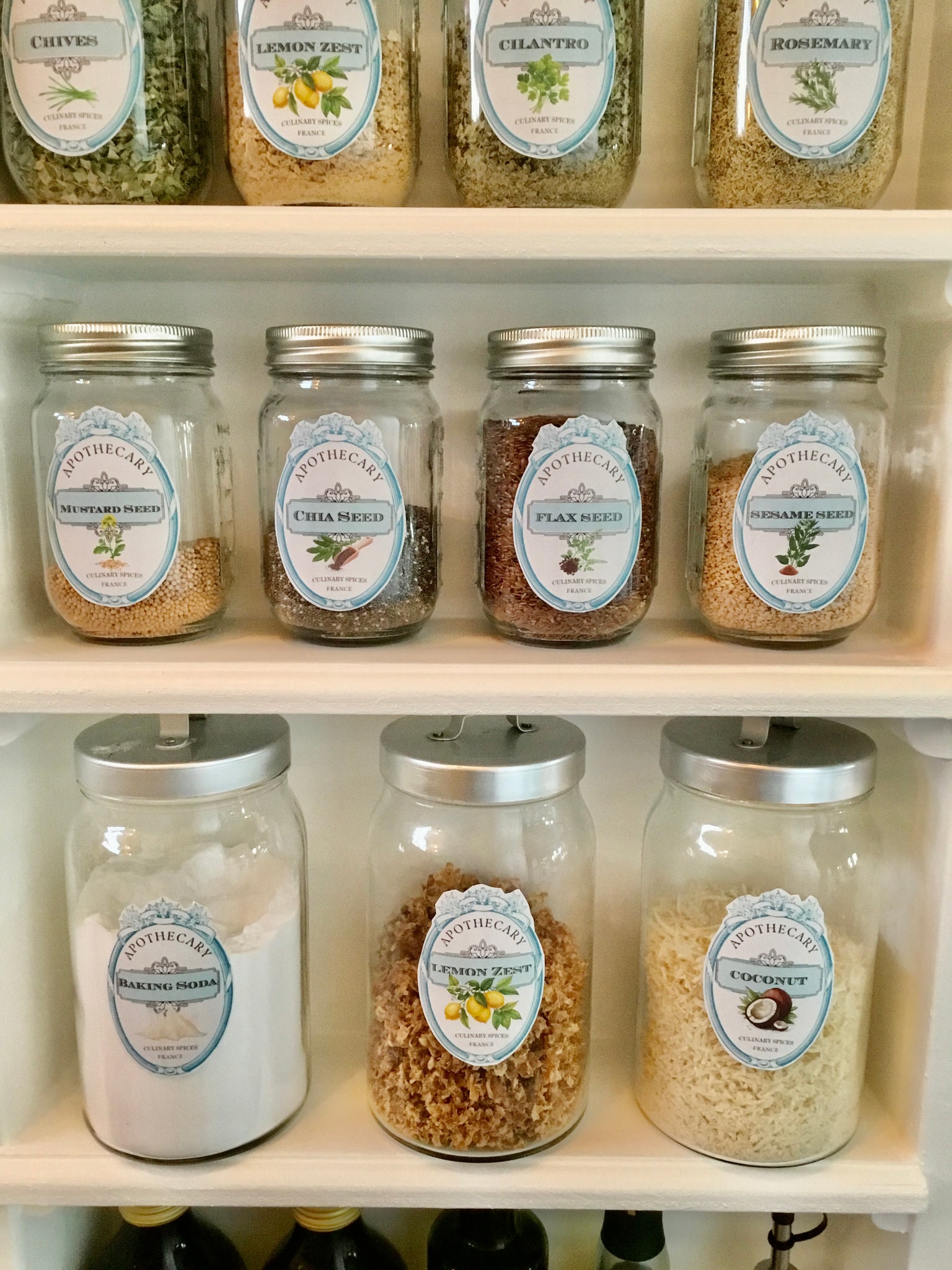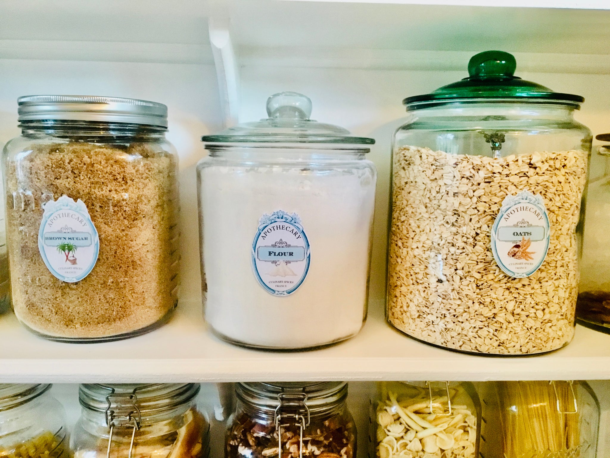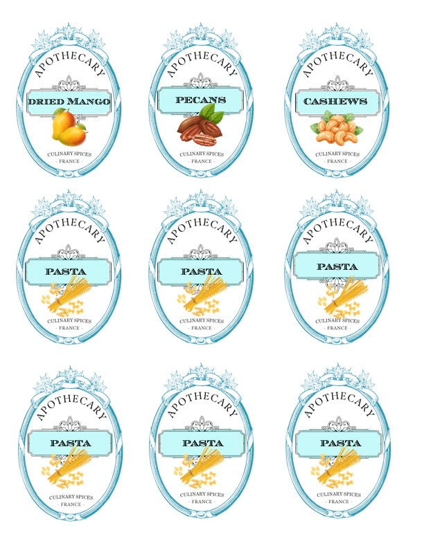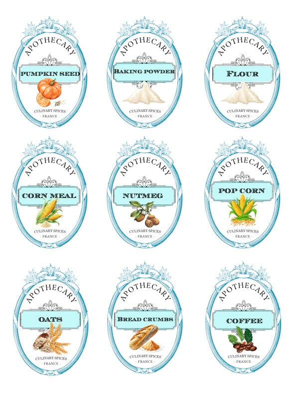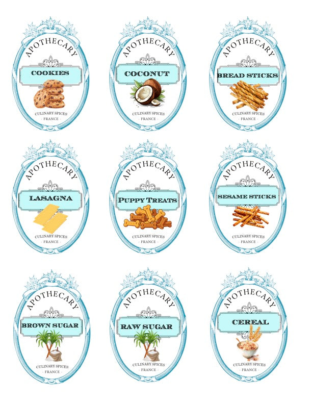 Print from home on 8 1/2" x 11" full sheet white label paper, I recommend {TownStix...available on Amazon}. Cut out each label and affix to your kitchen jars or containers.